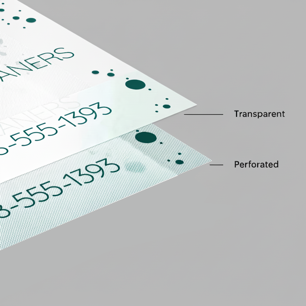 Perforated Vinyl: One-way vision material — visibility from inside, graphics visible outside.