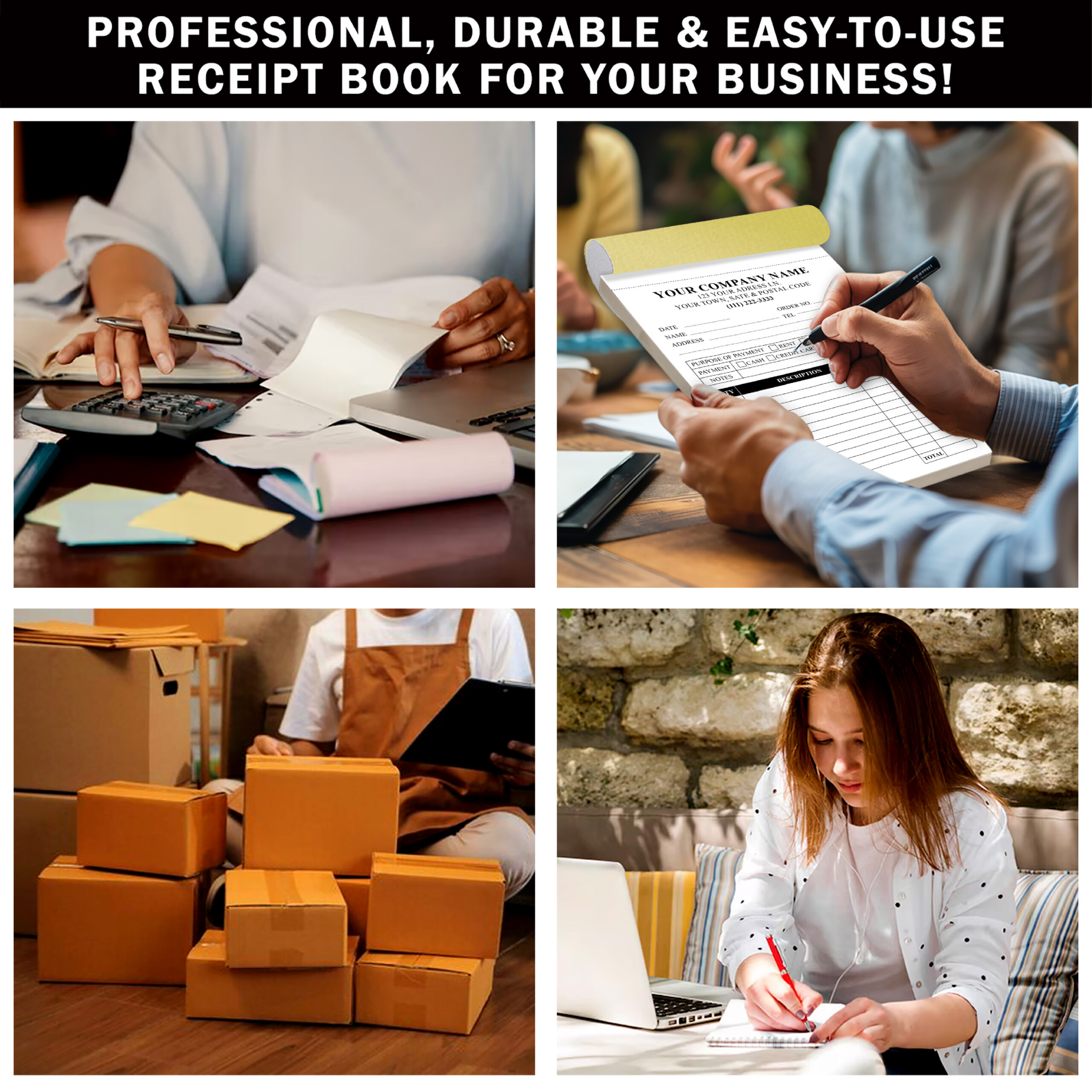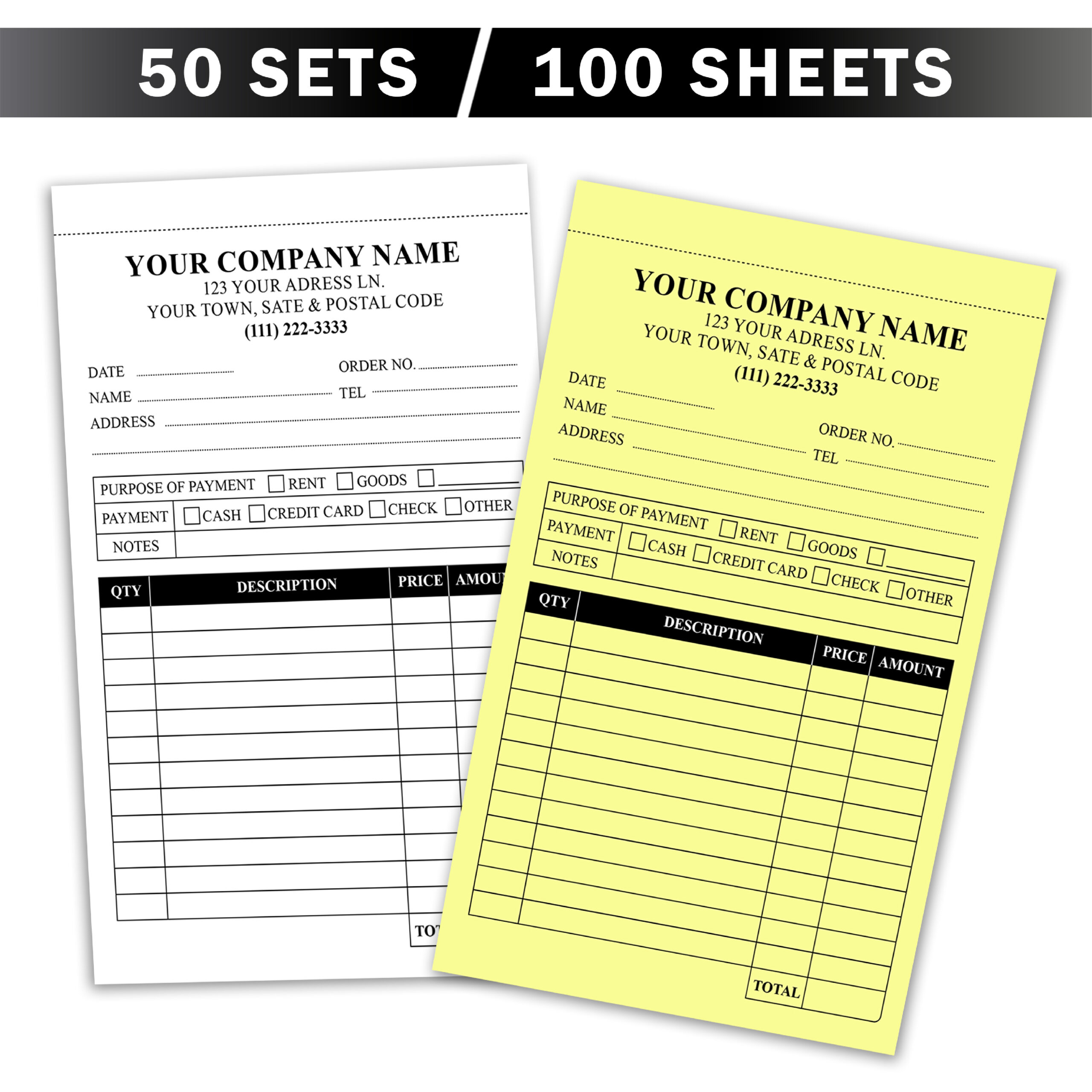 Each book includes 2-part carbonless copies (White & Yellow) with a total of 100 sheets per set: